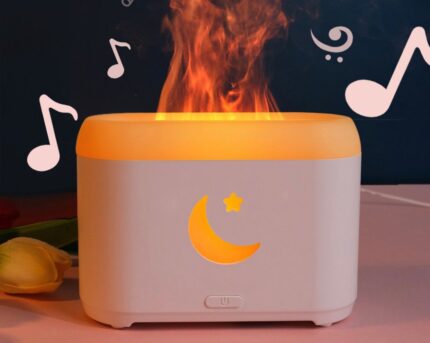 Exquisito difusor de aroma con luz de llama musical en tono blanco y diseño con una luna y una estrella en el frente, el cual convierte el aceite esencial y el agua en una niebla aromática y saludable a través de las vibraciones ultrasónicas que produce, brindando así una experiencia de fragancia inigualable y única.