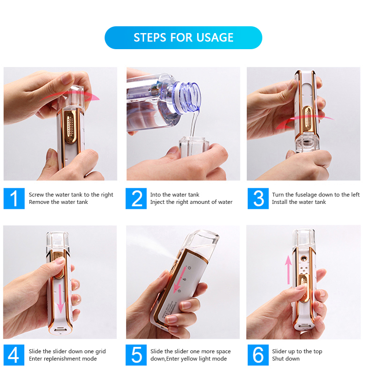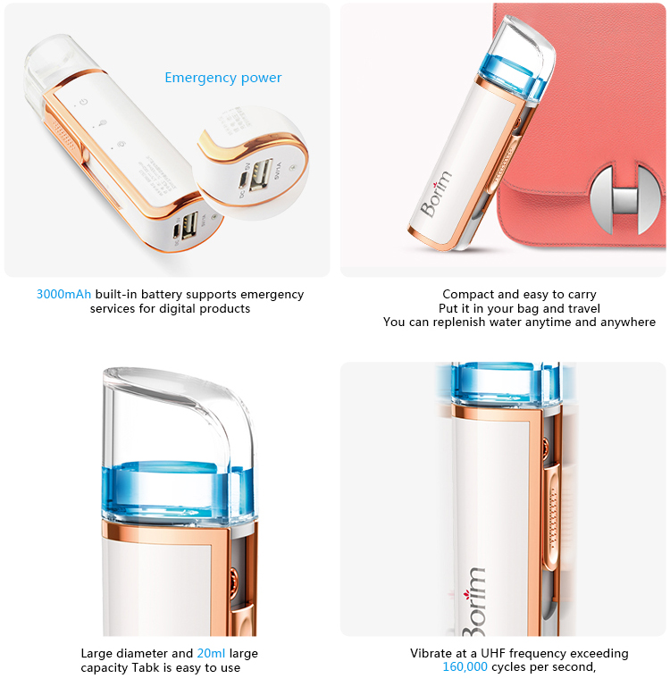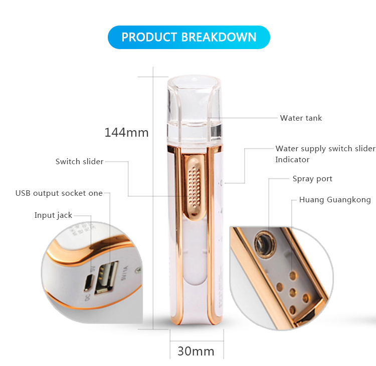 Vaporizador Facial de sistema operativo Ionizado y Nanotecnología ultrasónica. Sus principales funciones son Hidratar tu Rostro, darle Limpieza Profunda y Blanquearlo, además tiene la función extra de Power Bank de Emergencia para Cargar tu Teléfono con un puerto USB.
